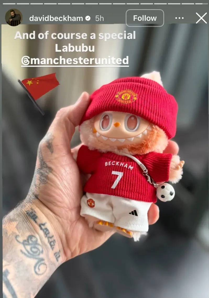 10月14日晚,贝克汉姆更新社交平台,晒出了特别定制款的曼联款Labubu,该Labubu身着贝克汉姆的7号球衣,身上还背了个小足球。网友感叹:贝克汉姆终于有Labubu了。