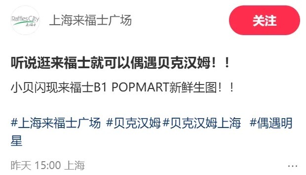 贝克汉姆逛的这家是上海来福士广场的泡泡玛特,来福士广场官方账号发文:逛来福士就可以偶遇贝克汉姆。